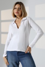 22113 KADIN GÖMLEK YAKA UZUN KOL GİZLİ FERMUARLI FULL LYC RİBANA YANLARI KUPLU PARÇALI ETEĞİ VOLANLI TSHIRT