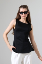 22068 KADIN KAYIK YAKA DOUBLE FACE YUMUŞAK DOKULU YANLARI KUPLU PARÇALI ETEĞİ VOLANLI KOLSUZ TSHIRT