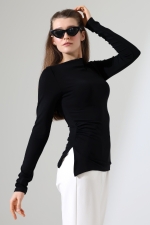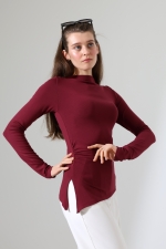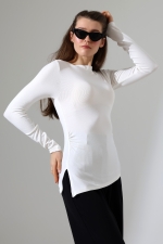 22138 KADIN KENDİLİĞİNDEN KAYIK YAKA SAĞYANI YIRTMAÇLI ASİMETRİK YANLARI LAST BÜZGÜLÜ FULL LYC VORTVİSK RİBANA UZUN KOL TSHIRT